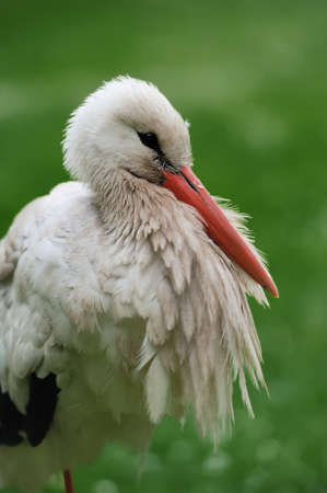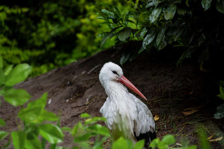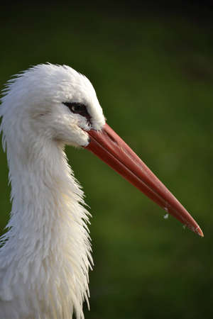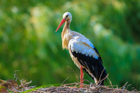 Closeup portrait of a Stork bird, Ciconia ciconia, on a nest in a green habitat