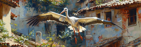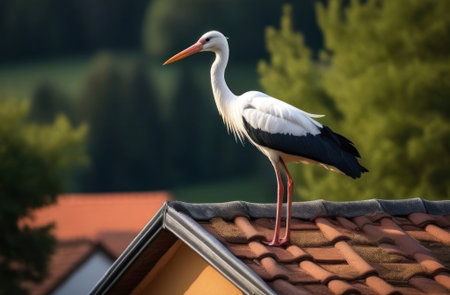 Elegant stork perched on a rooftop, blending seamlessly with the serene, verdant background, showing the beauty of nature. Generated A.I.