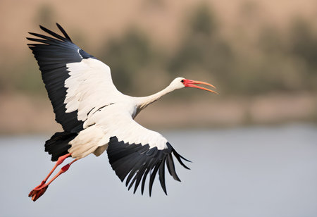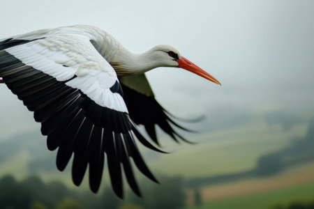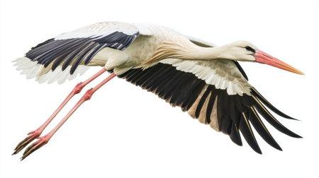 magnificent white stork glides effortlessly through the air, its long, elegant legs trailing behind as it navigates a bright, white expanse, embodying freedom and grace.