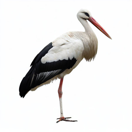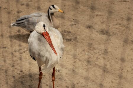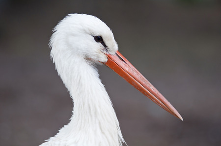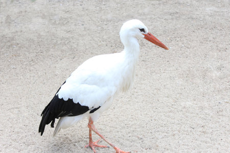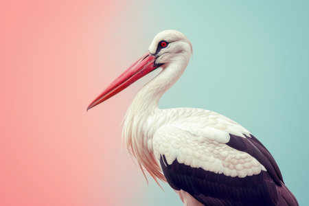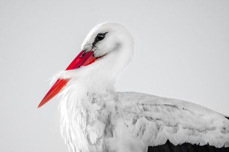 A beautiful stork gazes intently, showcasing its vibrant red beak and intricate feathers.