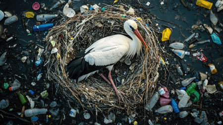 Stork nest entangled with plastic waste, including microplastics and PET bottles, highlighting the severe impact of pollution on wildlife and natural habitats.