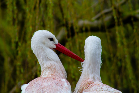 Two white storks with red beaks standing close together, surrounded by greenery. The birds are facing each other, showcasing their elegant feathers and striking features.