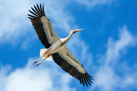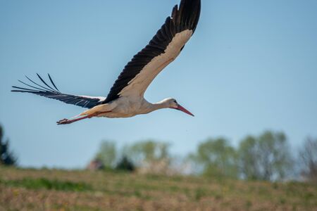 The white stork (Ciconia ciconia), flying with widely spread wings. blue sky. In the Netherlands, Europe.