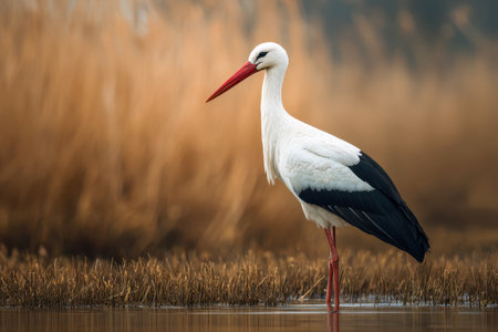 A slender white bird with an vivid crimson bill pauses serenely in tranquil marshes, framed by softened golden reeds that highlight its elegant stature.