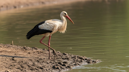 A white stork standing on a muddy riverbank next to calm water. The bird's long red legs and beak are visible as it hunts or rests in its natural wetland habitat.