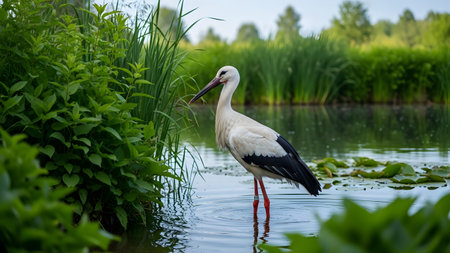 A graceful white stork stands in the calm water of a pond, surrounded by lush green reeds and aquatic plants. The bird's red beak and legs contrast beautifully with the natural green environment, capturing a peaceful moment in the wetlands.