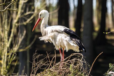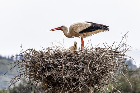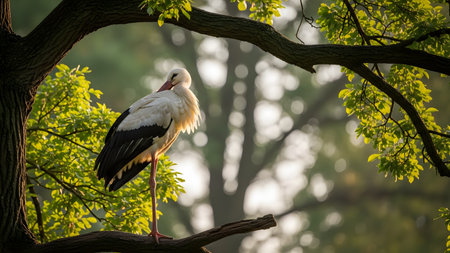 Pair of storks building a nest on a tall tree, their long legs and elegant movements highlighting their unique beauty