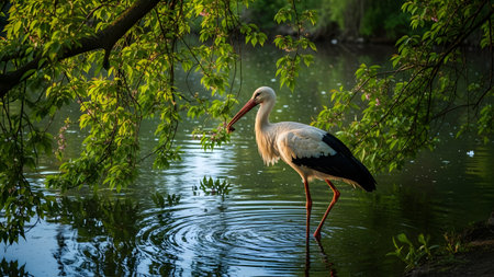 A white stork stands in a pond framed by hanging green branches, holding a small catch in its beak. The ripples in the water and the lush foliage create a peaceful and natural wildlife scene.