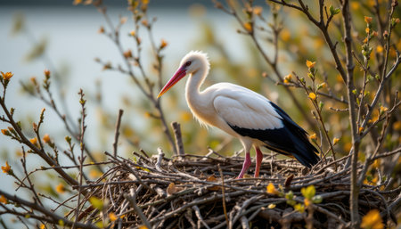timeless stork photographed in a nesting pose in a riverside thicket, in a classic wildlife photography style, with off white tones, soft daylight, high resolution