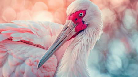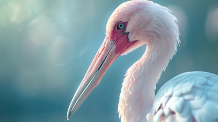 Close-up of pink flamingo with detailed feathers and sharp beak against soft, bokeh background