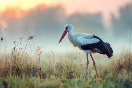 Stork wading in serene misty wetlands at sunrise. That the image is generated using AI.