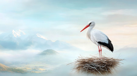 Watercolor Illustration of White Stork Perched on Nest with Mountainous Landscape Background Depicting Natural Wildlife Scenery and Serene Atmosphere, Copy space.