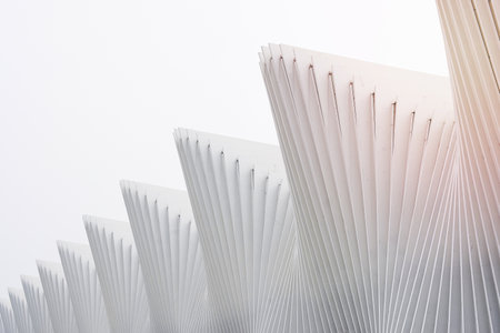 A close-up view of a modern building's exterior, showcasing its sleek, white, fan-like architectural design against a bright sky.