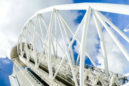 Curved construction on the arch ceiling of the bridge of peace, Tbilisi, modern architecture in Georgia. White metal pipes structure supporting roof in building. Abstract curve line background.