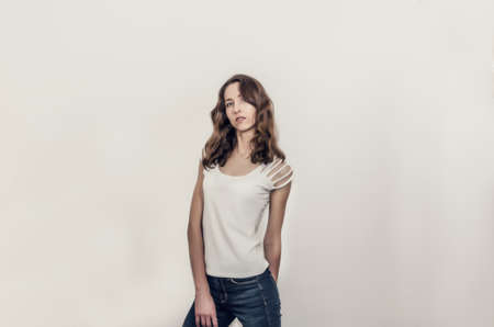 Sexy woman in a white T-shirt on a gray background. Mock-up.