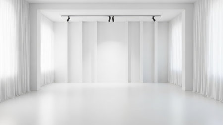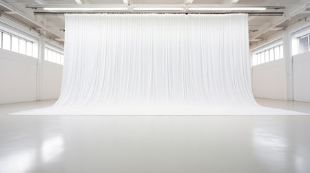 Empty studio space with white curtains and ceiling spotlights isolated on a white background