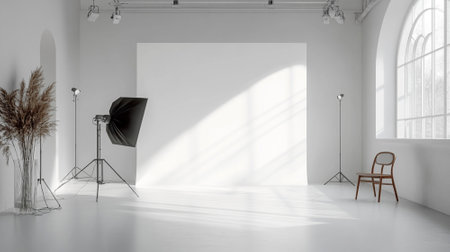 A modern photography studio featuring a bright, white backdrop and professional lighting equipment. This spacious environment invites creativity and artistic expression.