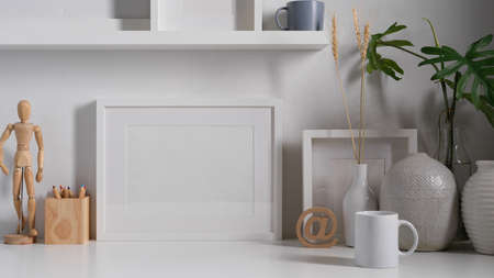 Close up view of white concept worktable with supplies, mock up frame, decorations and copy space