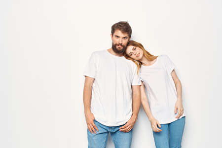 Two cheerful friends in white t-shirts stand side by side cropped view