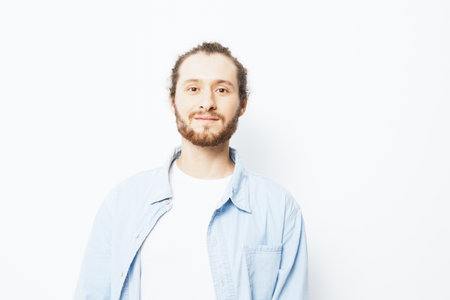 Smiling young man with a beard in casual denim shirt stands against a white background, radiating confidence and positivity, ideal for lifestyle and wellness themes