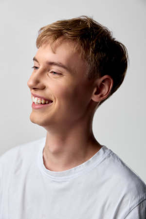 Smile, young man in casual shirt, side view against light backdrop, exuding friendly energy, confident vibe and approachable mood. Clean studio setting emphasizes natural charm and relaxed style.