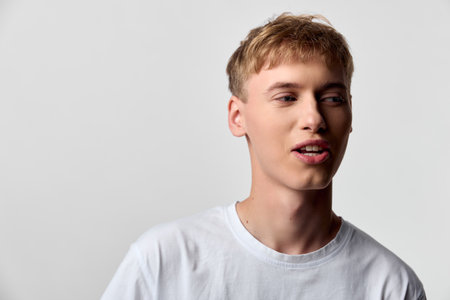 Young man, face with calm expression, wearing white tshirt, soft lighting, neutral background, casual style, looking away, simple studio setup for lifestyle or fashion use