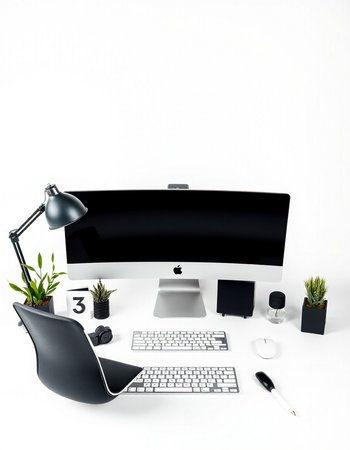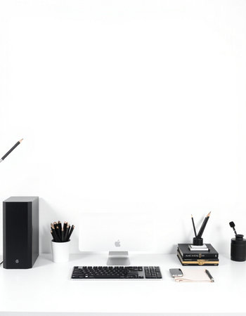 Minimal workspace with computer, keyboard, mouse and accessories on white background
