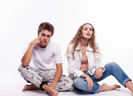 young pretty couple together posing cheerful isolated on white background, lifestyle people concept, happy boy and girl