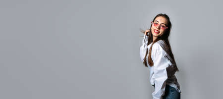 Web banner Studio portrait of exciting expressive emotional young woman with long hair in pink pixel glasses. Trendy stylish gen z girl in white shirt and jeans in motion on grey background