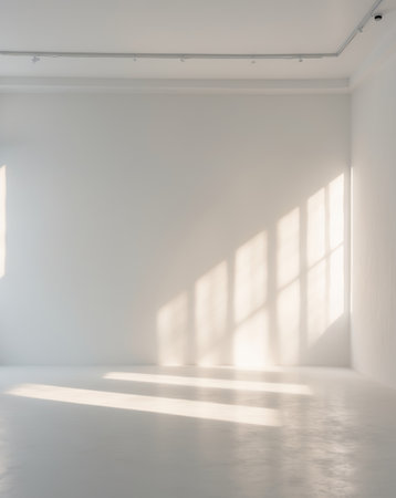 An empty white room with a window, shadows from the light for product presentation, to create a background for your photos, overlay. Shadow and light from windows on a white wall, reflections.