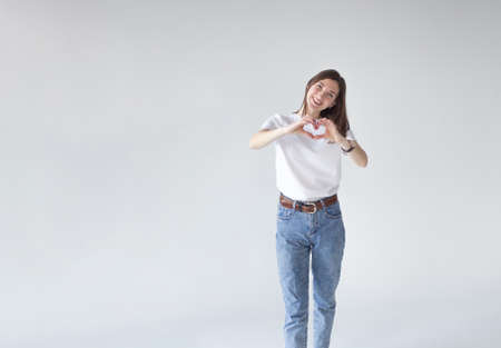 A close-up portrait of a smiling happy young woman making a heart sign, a symbol with her hands isolated on a white background.