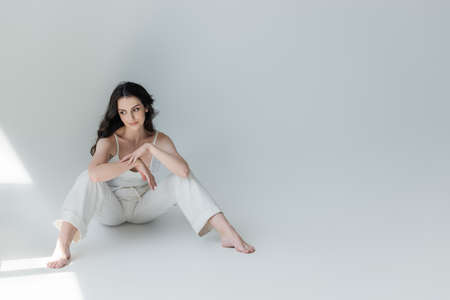 A woman is posing in a minimalist room. She is sitting on the floor. She has short hair and wears a white sweater. Natural light fills the space, highlighting her look.
