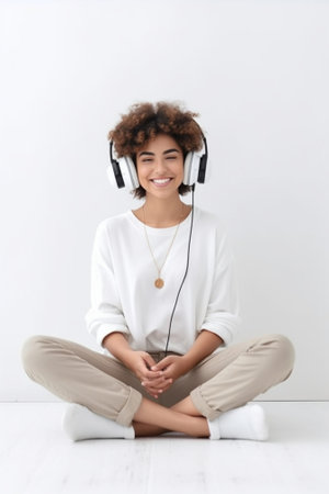 Generative AI : happy young woman in headphones listening to music in a room with a blank wall