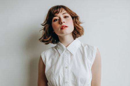Young woman with short brown hair wearing sleeveless white shirt posing confidently against plain light background