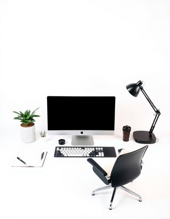 Office desk with computer, keyboard, mouse, coffee cup and plant on white background