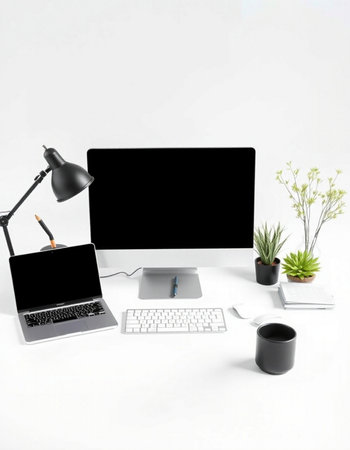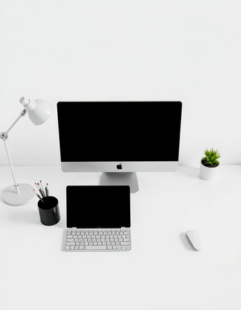 Bright and minimalist workspace featuring a computer, laptop, and phone, emphasizing a clean aesthetic and efficient workflow for creators.