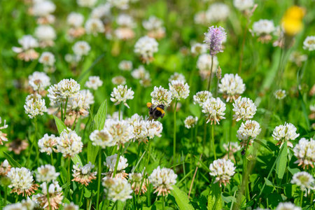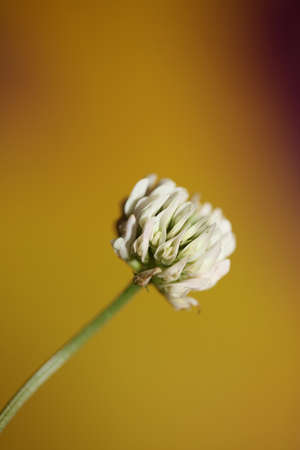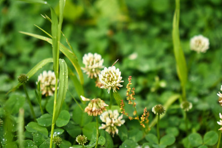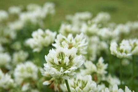 Trifolium repens, white clover flower in meadow closeup selective focus