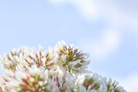 Blurred photo of white clover aka Trifolium repens in grass on summer meadow. Close up of shamrock flower in blue sky blurred background. Nectar source flowering plant