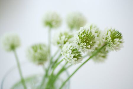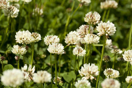 White clover flowers in spring - photo with shallow depth of field. The white clover on a meadow. Flower of white clover