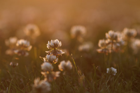 White creeping clover trefoil on the lawn at sunset close-up.
