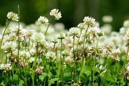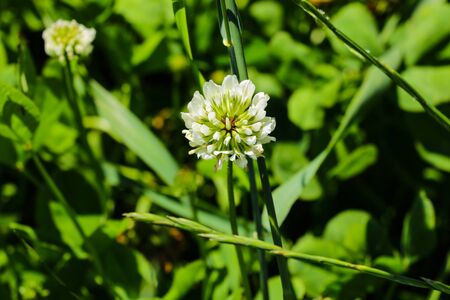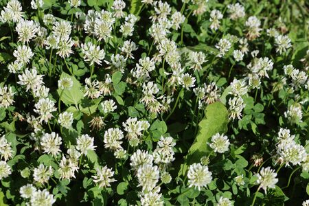 Trifolium repens white dutch ladino clover wild flowering plant, white meadow flowers in bloom, green leaves