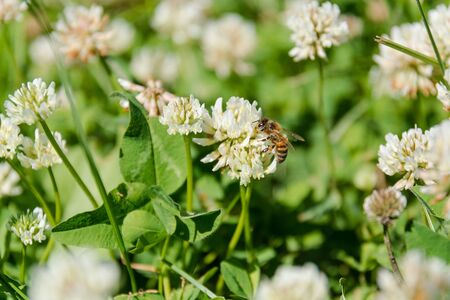 Clover with a bee. White clover. The bee pollinates a clover in the field.