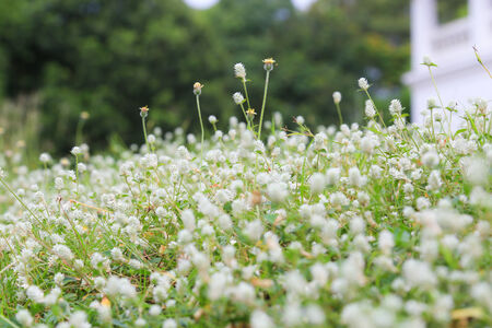 Selective focus Green grass and little white wild flowers meadow with soft style. Blossoming Tiny Wild White Flower Eriocaulaceae.