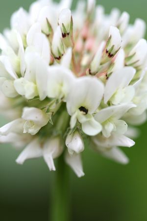 Close up of white clover flower blooming on green background.