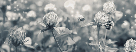 A panoramic selective focus shot of white clover