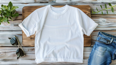 White T Shirt mockup flat lay on wood background