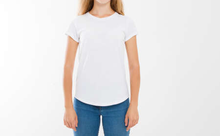 young caucasian, europian woman, girl in blank white t-shirt. t shirt design and people concept. Shirts front view isolated on white background. Mock up. Copy space.