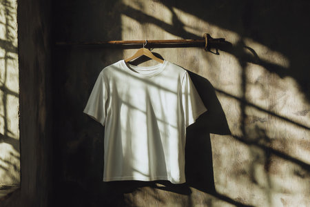 Plain white t-shirt hangs against a grungy, textured wall for a modern urban look.