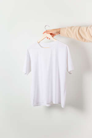 Male hand holds hanger with blank white t-shirt
