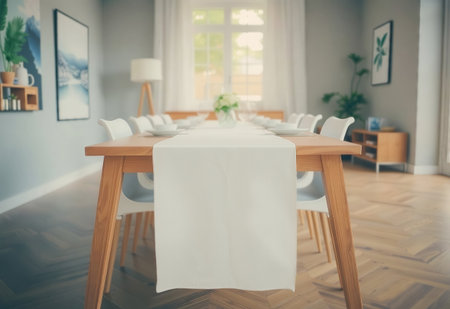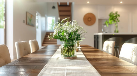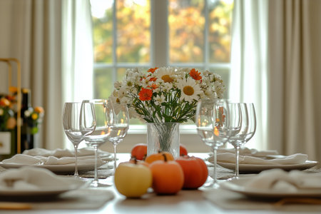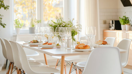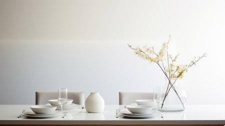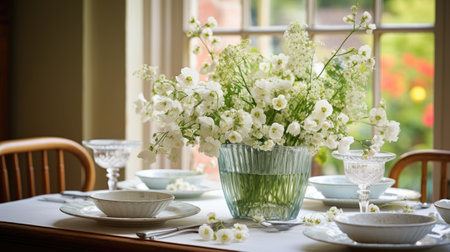 An elegant dining table adorned with tableware, a vase of flowers, and glasses, creating a beautiful centerpiece in the houses interior design